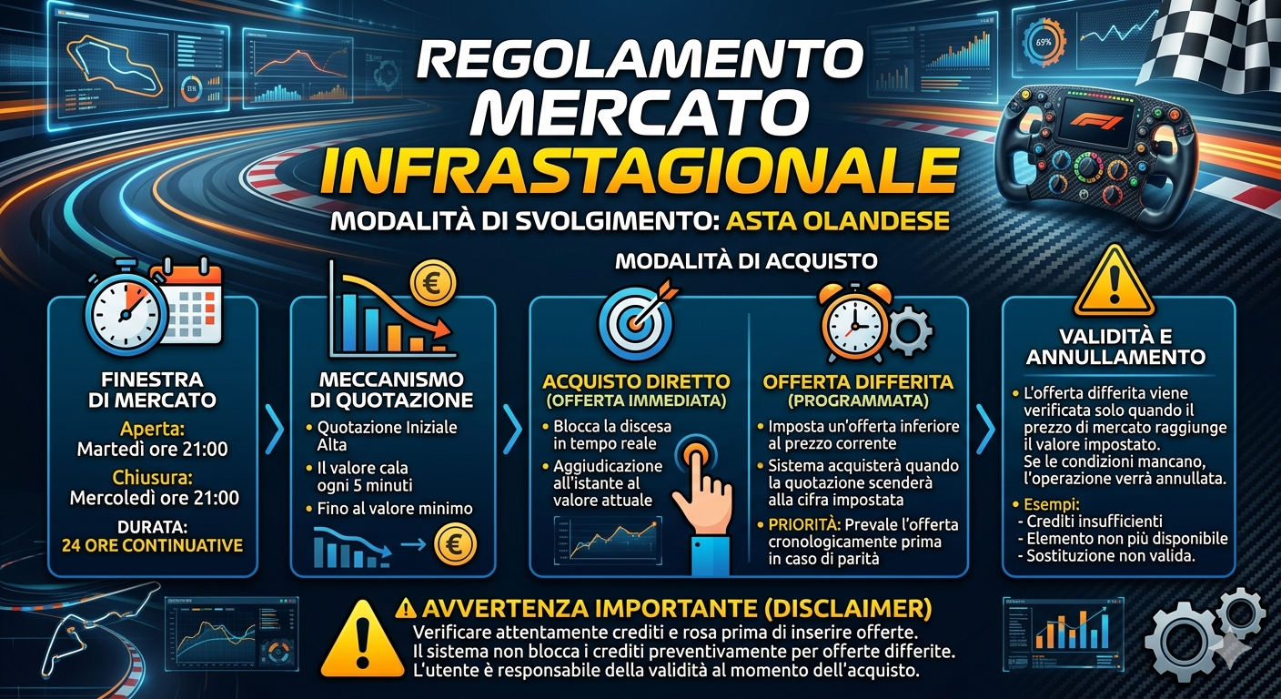 REGOLAMENTO DEL MERCATO INFRASTAGIONALE [Schema riassuntivo][Video] Modalita' di svolgimento: Asta olandese Il mercato infrastagionale si svolge ogni settimana esclusivamente online tramite l'apposita sezione nell'area di gestione della propria scuderia. Il sistema adottato è quello dell'Asta Olandese, un tipo di asta che funziona al contrario: invece di partire dal basso e offrire di più, si parte da un prezzo alto e il valore scende col passare del tempo. L'elemento e' aggiudicato a chi per primo decide di "fermare" la discesa (anticipando gli avversari che attendevano una quotazione inferiore). Svolgimento dell'asta L'asta inizia alle 21.00 di martedi' e termina alle 21.00 di mercoledi', e in questo periodo si potranno fare le offerte. Ogni elemento disponibile parte da una quotazione iniziale prestabilita. Questo valore scendera' progressivamente ogni 5 minuti circa (step), raggiungendo il valore minimo per la fine dell'asta. Modalita' di acquisto Esistono due modi per aggiudicarsi un elemento: L'offerta verrà valutata non appena la quotazione scendendo raggiungerà la cifra impostata, ma se in quel momento l'offerta non fosse valida per le mutate condizioni del mercato, l'offerta verrà annullata. Esempi di annullamento dell'offerta potrebbero essere: - crediti non disponibili (anche considerando il recupero fantaeuro dell'elemento sostituito) - elemento che si vuole acquistare non piu' disponibile - elemento che si vuole sostituire gia' venduto Tenete conto che: - Scaduti i 5 minuti dello step si comincia a esaminare le offerte partendo dagli elementi piu' in alto nella lista presente sul sito - Le offerte differite vengono valutate alla fine di ogni step, quindi alla fine di ogni 5 minuti. Quindi fra un'offerta fatta alla fine dello step piu' alta di una offerta fatta all'inizio dello step "vince" quella piu' alta anche se fatta cronologicamente dopo (ma nell'arco degli stessi 5 minuti) Nel caso pero' ci fossero più offerte programmate dello stesso valore, prevarrà quella inviata cronologicamente per prima. Modifica delle offerte e avvertenze Ogni offerta per un elemento che non e' stato gia' aggiudicato puo' essere cancellata e o modificata in qualsiasi momento, permettendo alla scuderia di riformularla in base alle nuove strategie di mercato. Il sistema vi permette di fare qualsiasi tipo di offerta differita (per assurdo potreste impostare un'offerta per tutti gli elementi disponibili) Le offerte vengono elaborate nell'ordine in cui appaiono sul sito (quindi se fate due offerte con lo stesso importo e lo stesso sostituto su due elementi che hanno la stessa quotazione e potreste entrambe aggiudicarvele, vi sara' aggiudicata quella che appare piu' in alto nel sito) Esempi Il pilota Lando Norris e' disponibile nel mercato infrastagionale e la sua quotazione iniziale e' di 3.000.000 di fantaeuro e scende (ipoteticamente) di 10.000 feuro ogni 5 minuti. L'asta parte e nei primi 5 minuti nessuno fa offerte di 3.000.000 per Lando Norris. Quindi la quotazione di Lando Norris scende a 2.990.000. Passano altri 5 minuti, nessuno fa offerte e la quotazione scende a 2.980.000 Decido di attendere e mi ricollego dopo circa 6 ore: vedo che Lando Norris e' ancora dispobibile e la quotazione e' di 2.300.000 feuro. Questo prezzo mi va bene e quindi faccio un'offerta di 2.300.000 feuro e Lando Norris mi viene aggiudicato. Il pilota Oscar Piastri e' disponibile nel mercato infrastagionale e la sua quotazione iniziale e' di 1.000.000 di fantaeuro (e una discesa di quotazione di 10.000 ogni 5 minuti). L'asta parte e la scudiera AAA offre 500.000 per Oscar Piastri. Essendo la quotazione attuale di Oscar Piastri di 1.000.000 l'offerta della scuderia AAA non viene al momento considerata, ma rimandata. Nei primi 5 minuti nessuno fa offerte da 1.000.000 per Oscar Piastri, e quindi scende a 990.000. E se nessuno fa offerte per Oscar Piastri ogni 5 minuti la sua quotazione continua a scendere di 10.000. Se la quotazione arriva a 500.000 si "attiva" l'offerta della scuderia AAA che se lo aggiudica a 500.000. All'inizio dell'asta Alexander Albon e' quotato 3.000.000... vorrei prenderlo, ma non voglio spendere cosi' tanto, quindi imposto un'offerta differita di 1.000.000. A meta' sessione Alexander Albon ha una quotazione di 1.500.000 e non e' ancora stato aggiudicato. Preso dall'ansia di non aggiudicarmelo, decido di volermelo prendere subito a 1.500.000. Quindi cancello l'offerta da 1.000.000 che avevo fatto e ne faccio una nuova immediata da 1.500.000. E mi aggiudico subito Alexander Albon Oppure, se avessi pensato che la quotazione potesse andare piu' in giu', posso cancellare l'offerta differita da 1.000.000 e metterne una piu' bassa. O... non metterne affatto e fare un'offerta immediata quando il prezzo mi soddisfa (sempreche' gli altri non mi soffino l'elemento) Fra le mie offerte c'e' 500.000 per Kimi Antonelli e 700.000 per George Russell. Riesco ad aggiudicarmi George Russell per 700.000, e quando si arriva a condiderare l'offerta per Kimi Antonelli mi rimangono solo 350.000 fantaeuro (con il recupero dei crediti del sostituto). Quindi anche se me lo sarei aggiudicato, non potrei acquistare Kimi Antonelli perche' non ho abbastanza crediti... e quindi la mia offerta su Kimi Antonelli viene annullata. Possiedo Max Verstappen e lo voglio sostituire. Sono disponibili: Isaack Hadjar (con quota attuale di 2.500.000) Charles Leclerc (con quota attuale di 2.000.000) Lewis Hamilton (con quota attuale di 1.800.000) Inserisco le offerte Isaack Hadjar 1.500.000 ---> in sostituzione di Max Verstappen Charles Leclerc 1.500.000 ---> in sostituzione di Max Verstappen Lewis Hamilton 1.500.000 ---> in sostituzione di Max Verstappen Mano mano che l'asta prosegue le quotazioni degli elementi scendono e si arriva a queste quotazioni 2.300.000 Isaack Hadjar 1.800.000 Charles Leclerc 1.650.000 Lewis Hamilton Non succede niente (nessuna offerta e' superiore alla quotazione attuale) e si prosegue. Le quotazioni continuano